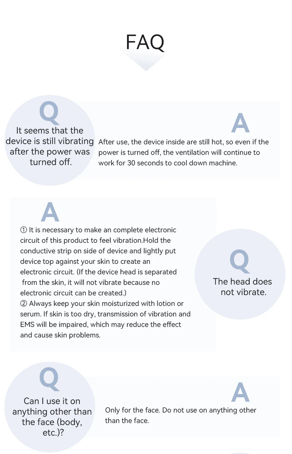 R: ① Il est nécessaire de faire un circuit électronique complet de ce produit pour ressentir les vibrations. Tenez la bande conductrice sur le côté de l'appareil et placez légèrement le dessus de l'appareil contre votre peau pour créer un circuit électronique. (Si la tête de l'appareil est séparée de la peau, elle ne vibrera pas car aucun circuit électronique ne peut être créé.)