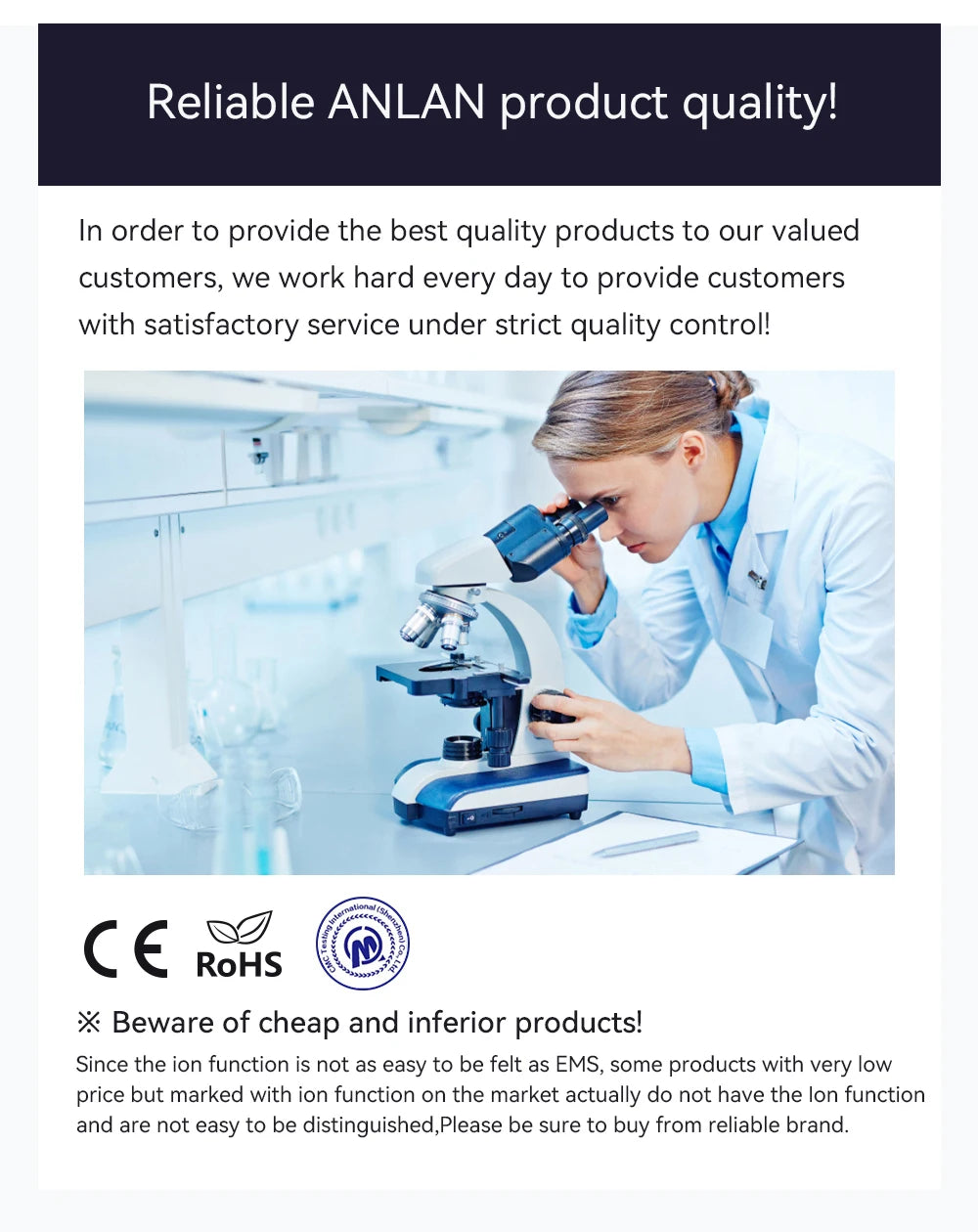 Les performances sont améliorées de 38%. La durée de fonctionnement est environ 2 fois celle de l'ancienne version du masseur facial ANLAN EMS.
