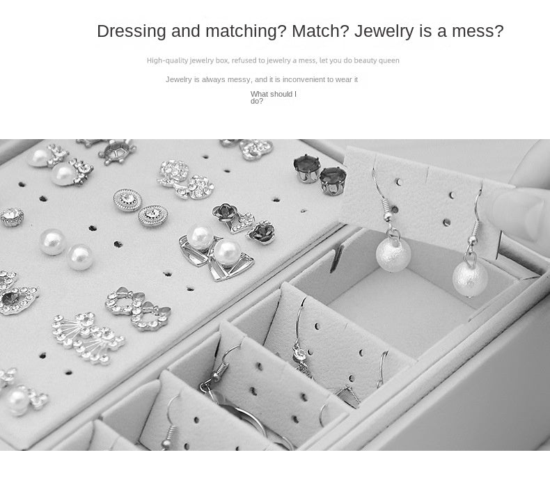 Élégamment conçue avec une structure à double couche, cette boîte à bijoux offre suffisamment d'espace pour tous les types d'accessoires de bijoux, ce qui en fait un choix idéal pour tous ceux qui recherchent une solution de rangement polyvalente.Le plateau supérieur comporte divers compartiments, notamment des fentes pour bagues, des crochets de sécurité pour accrocher des colliers et des bracelets et des fentes pour les boucles d'oreilles.La couche inférieure spacieuse peut contenir des objets volumineux tels que des montres, des boîtiers de montres ou des bijoux plus gros.