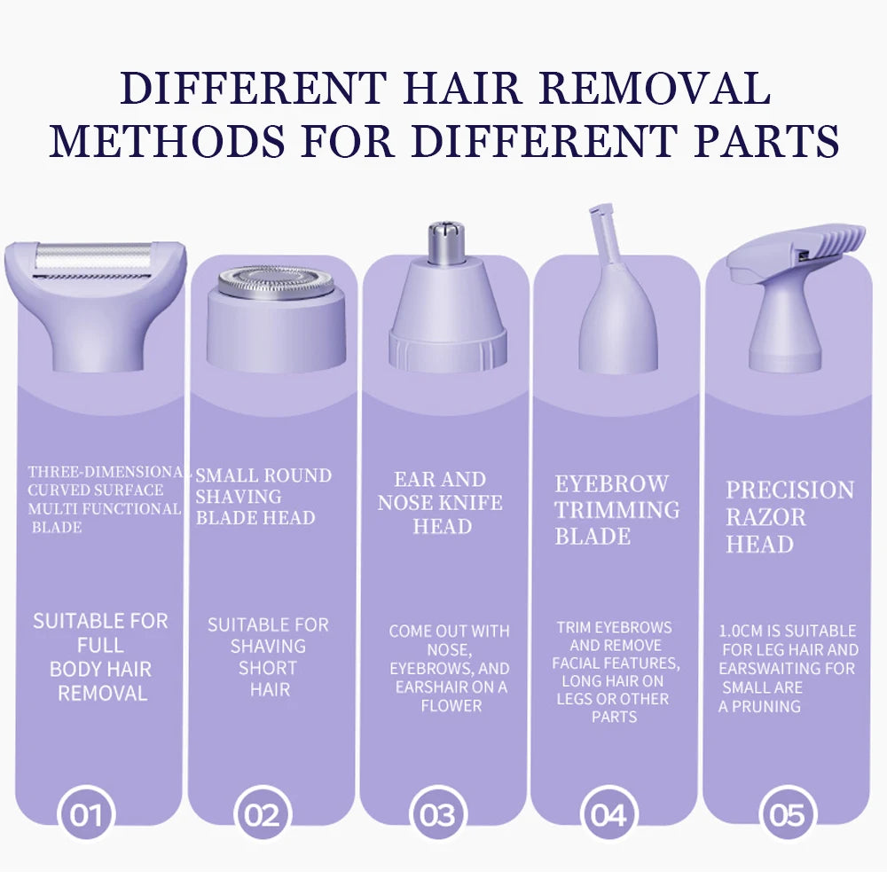 1.Ce rasoir multifonctionnel pour femmes combine la puissance d'un rasoir électrique, d'un rasoir à sourcils, d'un épilateur et même d'un épilateur d'oreilles et de nez, ce qui en fait un outil de toilettage tout-en-un pour les femmes.