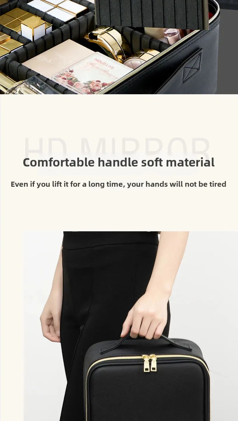 Trousse de maquillage Portable de grande capacité, avec miroir et lumière LED, mallette de rangement pour cosmétiques, Design élégant à fermeture éclair de couleur Pure